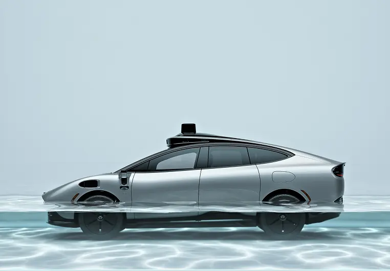 It was designed AI-first for autonomous driving capabilities, not heavily retrofitted on existing vehicles. Its minimalist exterior is a single, smooth liquid metal skin surrounding black sensor zones. Intelligence is incorporated everywhere, but the design is what catches your eye.