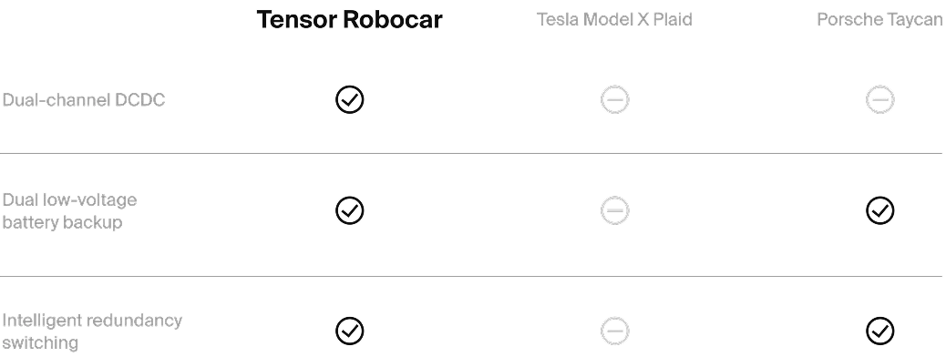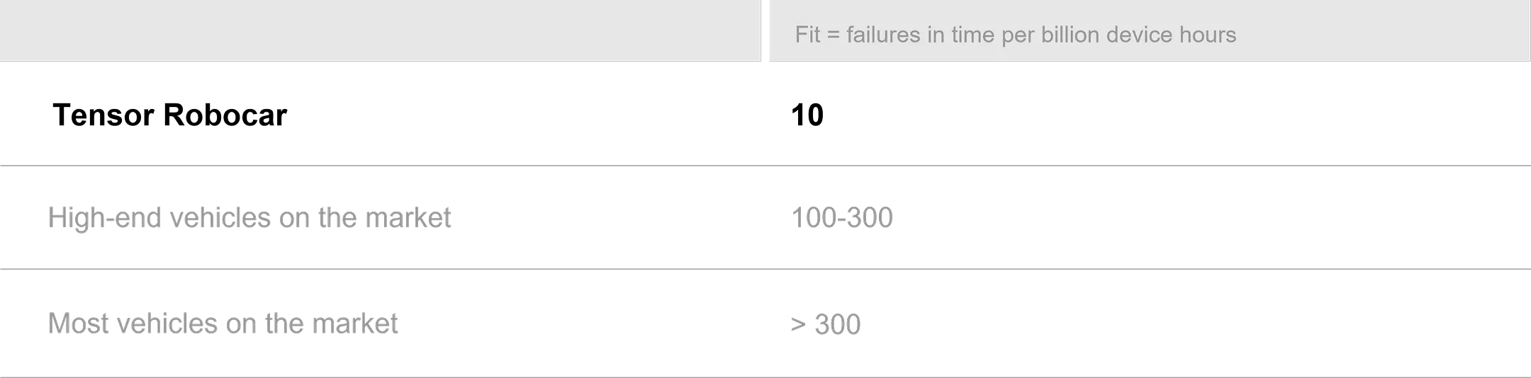 Tensor’s enhanced drive-by-wire system achieves a 10 FIT rate—just 10 failures per billion device hours—making it 10 to 30 times more reliable than current vehicles. Most cars exceed 300 F-I-T, while even high-end models with partial redundancy range between 100 and 300.