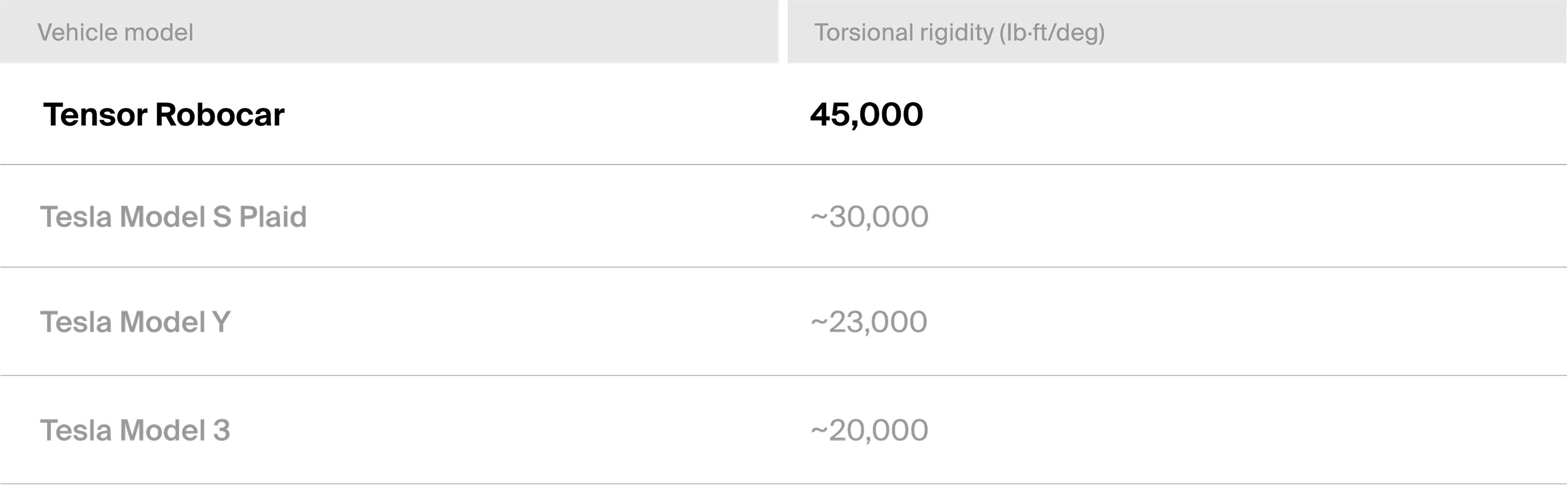 Tensor meets the toughest global crash standards, including FMVSS, IIHS Top Safety Pick+, and US NCAP 5-Star, as well as European and GCC requirements. Its body-battery integration delivers over 45k lb·ft/deg torsional rigidity, surpassing most EVs and matching million-dollar luxury cars.