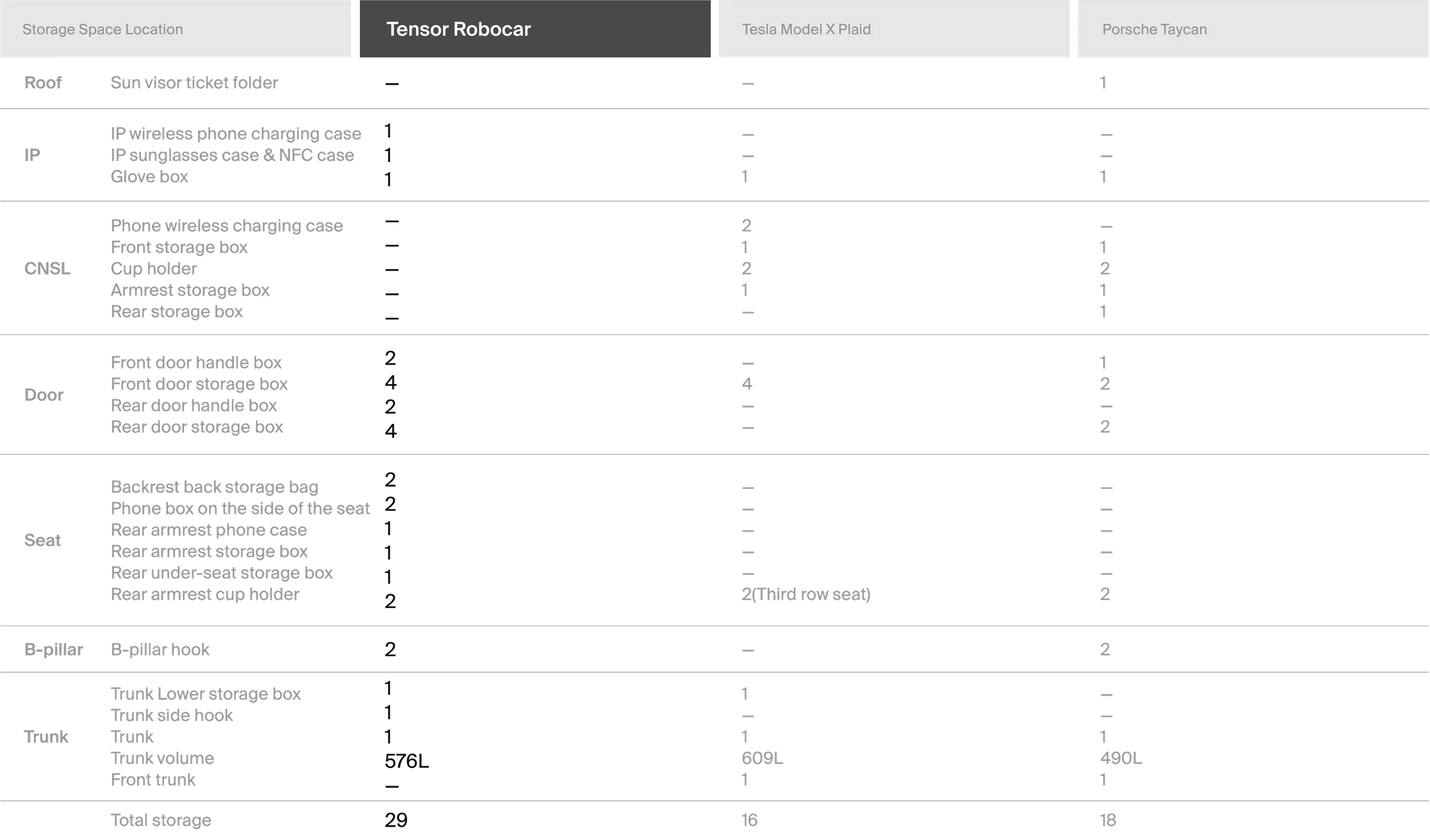 The vehicle includes an impressive 29 storage spaces throughout the cabin, significantly more than many popular high-end electric vehicles. For example, Tensor offers convenient extra storage compartments beneath the second-row seats, perfect for shoes and personal items.