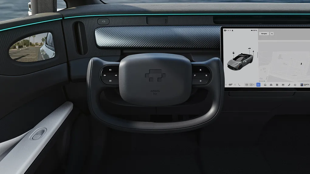 In the AI-abundant era, Tensor’s open cabin design—without a traditional center console—maximizes comfort and space. Foldable pedals, a retractable steering wheel, and a sliding center screen create a roomy interior that allows easy curbside exit or movement between front and rear seats.