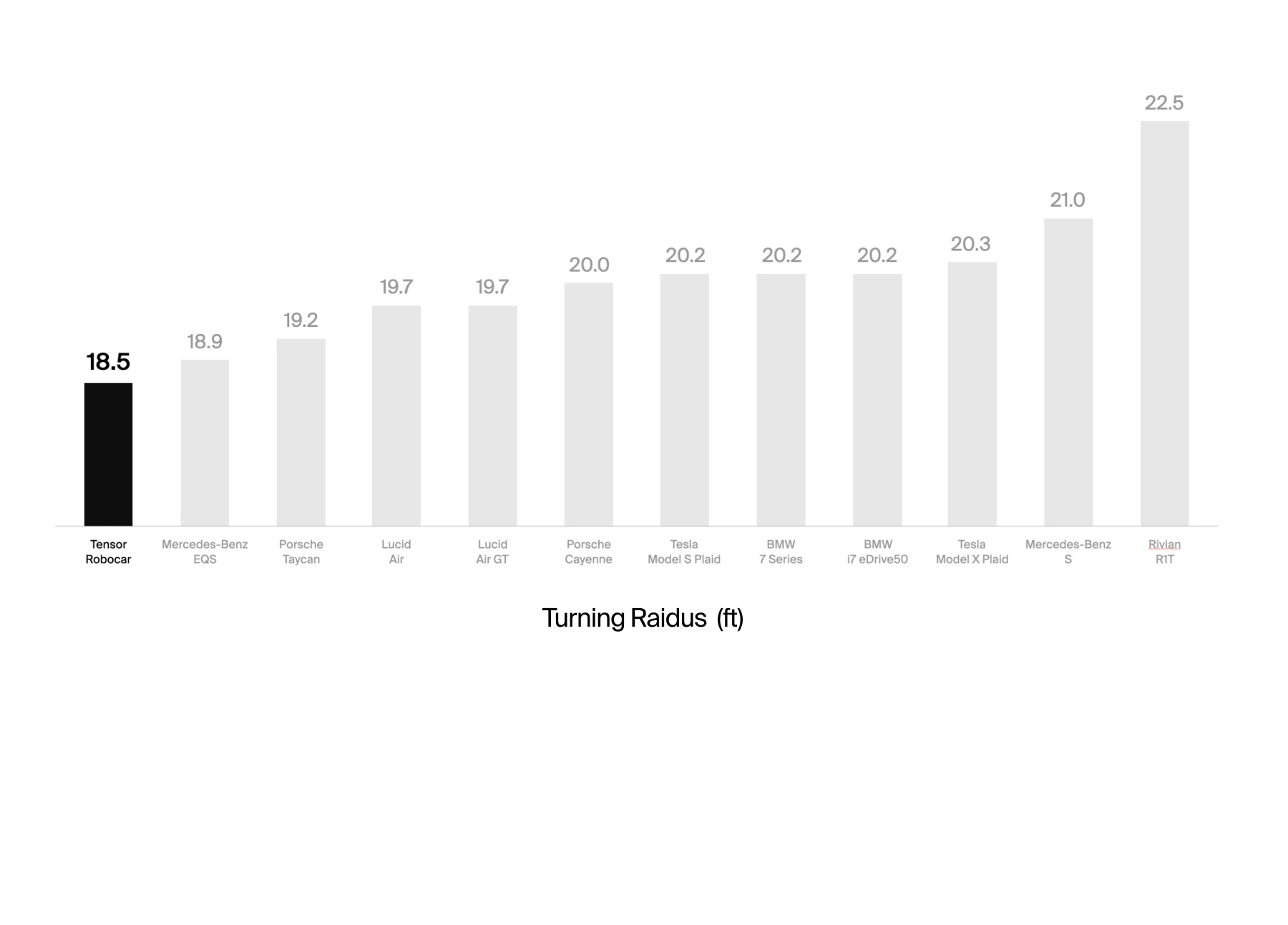 Tensor’s rear-wheel steering turns up to ±7°, giving it a compact 18.5-ft turning radius that outperforms vehicles of similar size. Its fully redundant drive-by-wire system enhances safety, while decoupled steering and braking provide smooth, customizable comfort and control.